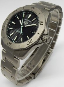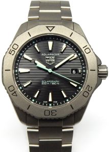 It’s kind of crazy that all us watch nerds still covet old fashioned technology, delicate, finicky, service intensive, somewhat accurate and absurdly expensive mechanical watches. Our latest estate watch isn’t even 2 years old and looks like it was never worn. The flat finish sandblasted titanium case is in perfect condition. The lab-grown sapphire crystal with anti-reflective coating is scuff free, offering a perfect view of the striped black dial. Even though this watch has a thick crystal, 3 hand display, date mechanism, solar collector dial, one-way ratcheting bezel, and screw on embossed case back, the watch makers at Tag Heuer have managed to keep the overall thickness down to just 10mm. I love the sky-blue seconds hand, SOLARGRAPH text, and dial plots outboard of the hour markers.