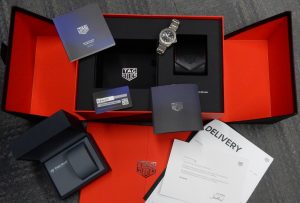 It was purchased directly from TagHeuer.com in June 2024 and comes complete with the huge box and travel pouch that are only available if ordered directly from the manufacturer.