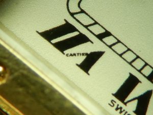A microscopic detail you may not even be aware of can usually be found on Cartier dials. A discreetly printed logo incorporated into one of the Roman numeral hour markers is a tiny feature often overlooked or poorly executed by counterfeits.