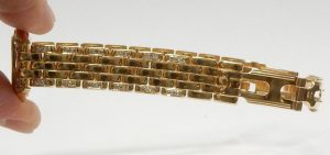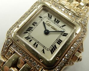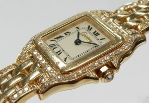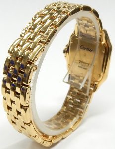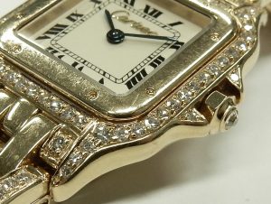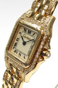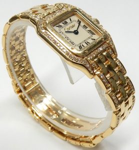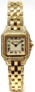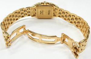 This Panthere is the traditional smaller size of 22mm making it perfect for the average sized ladies wrist who likes the sophisticated classic look of a modest sized watch. This is likely the first all gold Panthere we’ve ever offered in our estate department. The two-tone examples show up from time to time but seeing one in 18 karat gold is a rare event. The case shape, black Roman numerals with inner minute track and classic silver/parchment dial are all distinctive Cartier style details. It’s these details that define the look, helping to make Cartier one of the most desirable watches in the world. The 5 segment flexible link bracelet is infinitely flexible with a contoured locking buckle that seamlessly disappears in the link pattern when closed.