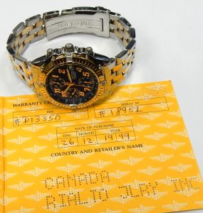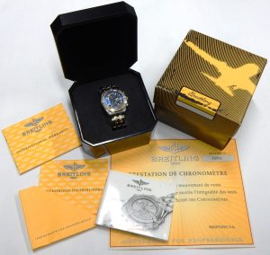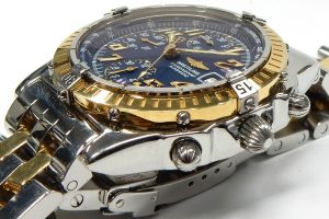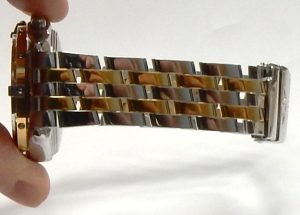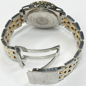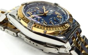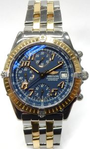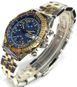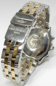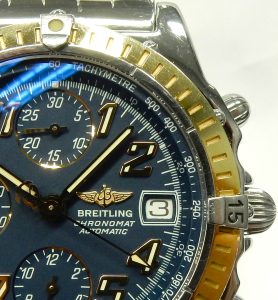 This vintage Breitling is a great place to start or add to any collection. It’s a comfortable 39mm in diameter, it’s bold, it’s all highly polished stainless steel and 18 karat gold; what’s not to like? The movement at the heart of this do it all watch is the venerable Valjoux 7750. It’s been upgraded by Breitling’s watchmakers to chronometer accuracy levels. This automatic winding movement has been in continuous service in some of the world’s most famous brands for well over 50 years and it’s still in production today. It’s amazingly reliable and familiar to every decent watchmaker anywhere in the world. It doesn’t have to go back to the manufacturer for service and replacement parts are readily available. It’s not uncommon for these robust mechanisms to go more than 10 years between service intervals.