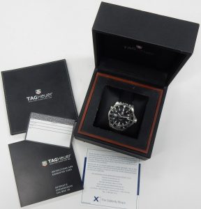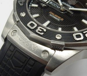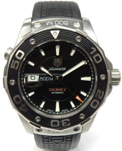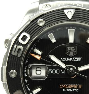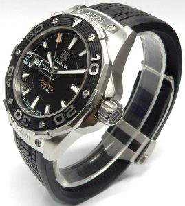 Some of Tag Heuer’s AquaRacers have evolved into very attractive “jewellery” watches over recent years. They were first introduced as a continuation of the very successful 2000 series in 2004. Every Aquaracer provides a rugged platform with serious sporting features. Don’t let the dramatic iridescent mother-of-pearl diamond dial fool you.