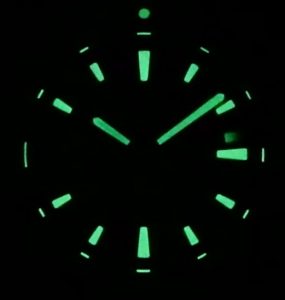 Highly luminous pigment has been added to the hands and hour markers make for easy time interpretation in low/no light situations. The minute hand and bezel zero index have green luminous material to distinguish them from the hour hand and hour markers.