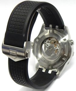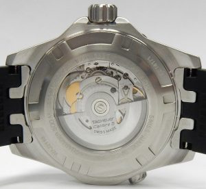 A thick display window on the case-back proudly displays the Tag Heuer Swiss made calibre 5 automatic movement that beats within the stainless steel case.