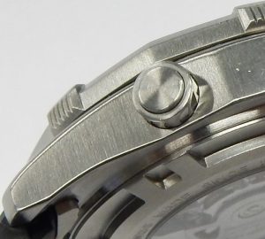 Tapered rectangular pushers control a 12-hour chronograph and a 1/4 turn locking crown prevents accidentally changing the time.