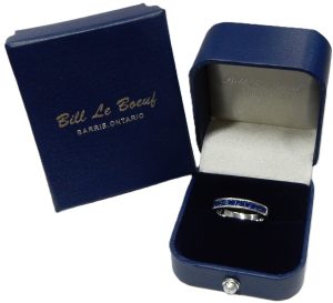 It was manufactured by Sophia Fiori Diamonds and is a current product (style #CSWP111339). According to the website the 15 sapphire weigh a combined 0.83 carat. Our calculations confirm this weight estimation. We have left the ring in original unpolished condition, showing scratches and scuffs on the shank sides and edges, but most of the factory applied rhodium finish is still intact. We will happily refinish the ring while you wait if you’d like it polished up to a mirror finish. This ring is pretty enough to be worn alone but will pair perfectly to any other ring with a flat edges shank. It is estate priced at $725.00 CAD. Stock #206-00422.
