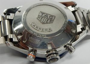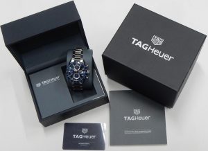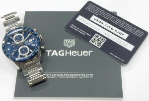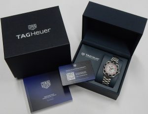 The watch that arguably saved the brand from extinction is back looking much as it did in 1985 but with modern technology. The Formula 1 was a superstar in the 80s, it was the watch to have, personifying the decade with bright coloured dials, straps and even colourful composite cases. They were the Swatch watch for the kids who had some money. We remember selling these way back then when they had a retail prices starting at under $300.00. Some of the newest Formula 1 models now feature “Solargraph” technology. The new quartz mechanism co-developed with  La Joux-Perret Manufacture in La Chaux-de-Fonds, Switzerland are powered by nothing more than exposure to natural or artificial light. Hidden behind the semitranslucent dial is a solar collector that can efficiently store a days worth of energy with just one minute of light exposure. A full charge is achieved after 40 hours of light exposure that lasts 10 months. The clever design also features a power save mode; when not in the light the movement enters into a power conservation mode, once exposed to light again it comes back to life after about 10 seconds. Tag Heuer say rechargeable power cell should be good for 15 years before needing replacing. That means this watch needs zero maintenance until the year 2040! The Formula 1 has always been an important watch for the brand. They have had several generations of style changes, always having a connection to the original. The newest incarnation is truly an homage to the first series. The case design is practically identical except brought up to a more modern 38mm diameter with much sharper edges, yet keeping that familiar silhouette. The timer bezel now rotates in both directions with 60 indexes, the crystal is a huge upgrade to lab-grown sapphire which will stand up far better the the 80s glass crystals. The guarded crown is a simple design, pull out to adjust rather than being threaded. Tag Heuer still rate the watch with a water resistance rating of 100 meters. You won’t find the Rolex inspired Jubilee style bracelet on this Formula 1, the newest F1 bracelet is an equally comfortable design featuring 3 segment links that resemble a Rolex Oyster link except much shorter. There is no diver extension concealed under the locking buckle but it is short and has a comfortably low profile. The silvery white dial is very similar to the 80s versions with red chapter ring indexed for minutes and logo shaped markers for 6, 9 and 12. The luminous hour plots are now applied rather than just printed. All and all we love the, “what’s old is new” vibe of the latest Formula 1. This example is in virtually new condition. It is only a few months old and was only occasionally worn during that time. There are only a couple of minute scuffs on the buckle that we could find as evidence of any use. It was bought in Ontario at an authorized Tag Heuer agent and benefits from the balance of the factory warranty. This is a new model shown on the Tag Heuer website with a suggested retail price of $2,550.00. Our hardly worn model comes with the original packaging and documents. It is estate priced at $2,100.00 CAD. Stock #520-00188.