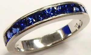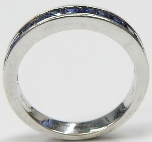 A blue sapphire anniversary ring without contrasting white diamonds sounds like a pretty dull ring, unless the sapphires look like this. These princess cut sapphires aren’t the typical inky blue/black colour we usually encounter in estate jewellery, they are a beautiful vivid cobalt blue hue. These are lab-grown sapphires produced using the same ingredients as mother nature but grown the laboratory. Like lab-grown diamonds, lab-grown sapphires provide a low cost option without sacrificing quality. The square princess cut shape allows them to be set side by side so close that they look like an uninterrupted bright blue stripe. The are flush set in a protective channel setting. The 14 karat white gold measures 3.6mm wide in a finger size 7. This ring weighs over 3.6 grams and features a thick full shank with solid shoulders.