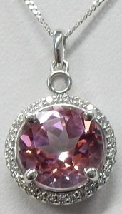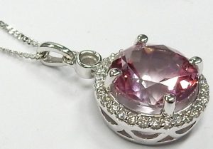 Topaz make an excellent choice for jewellery. They are one of the hardest gems, they have a relatively high refractive index making them sparkle and disperse white light into spectral colours, and can be very inexpensive. Common colorless and blue topaz can be purchased for only a few dollars per carat, while an exceptional pink topaz can cost over $1,000.00 per carat for a really nice one. This pink topaz has the sought after bubble gum pink colour but adds under $100.00 worth of value to this pendant/necklace. It is a common white topaz than has been colour enhanced by adding a durable transparent pink coating to the pavilion (bottom) of the gem. This surface film is very difficult to seen unless you know what you are looking at. It is stable to common jewellery cleaning solutions and is also ultrasonic safe.