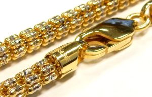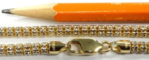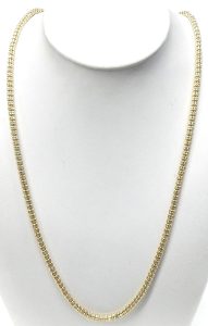 This necklace weighs a substantial 21.8 grams (0.7 troy ounce) in 10 karat gold (41.66% purity). With these two pieces of information you can easily calculate the value of the gold in this necklace this this. Current gold price ($6,200.00 CAD0 multiplied by the weight (0.7 ounces) multiplied by the purity (41.66%) equals $1,808.00. So even if this necklace has been run over by a train, it would still contain $1,808.00 in just gold value. Naturally it takes more than just raw gold to produce a finished piece of jewellery. It takes other precious metals to alloy, expensive machines to turn the raw metal into finished components, skilled craftsmen and women to assemble the parts, margins to make it worth while at the manufacturing end, duties if imported to Canada, and some retail margin at the point of purchase. All these costs easily double to triple to original gold cost. So this necklace priced at 57% over the scrap value represents very good value. The necklace measures 24 inches in length and 3.7mm wide.