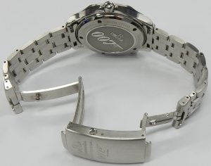 Before Tiger Woods was dumped by Tag Heuer as their biggest brand ambassador he helped out designing this watch. Tag Heuer’s golf watch has features that make it more suitable for the golf course than a heavy/bulky design that interfere with a nice swing, not to mention are not great for an automatic watch. Its unique features also make it quite different than almost any other watch. The combination titanium case and soft rubber strap only weigh less than 2 ounces. A slightly curved square case conforms to the natural wrist shape. A left side crown can’t dig into the back of your hand adding to the comfortable feeling. The black no-slip strap is as soft as a rubber band and has no fussy clasp to deal with. The Titanium case incorporates a locking deployment buckle built into the backside of the case. For fine-tuning the strap length, the buckle is equipped with an easy to use adjustment allowing up to 2cm of on the fly adjustment in only a few seconds.