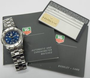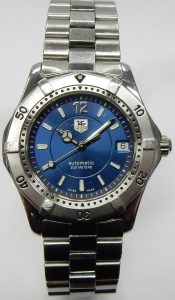 Sometimes the commonplace can become rare over time. Tag-Heuer is one of the world’s most popular brands of sports watches and we see a steady supply of their capable products come through our estate department. The 2000 Classic was a series of diver models offered in a variety of sizes, powered by either battery operated quartz or automatic winding movements.