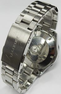 Sapphire crystal keeps that beautiful dial in sharp focus. There is a handy 31 day calendar that occupies the 3:00 o’clock position on the dial. The solid link bracelet comes with a mechanical locking buckle and diver extension.