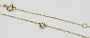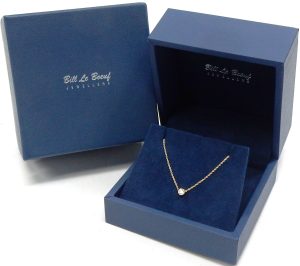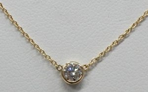 Both pendant and necklace have been made from upgraded 14 karat yellow gold with a total weight of 1.4 grams. It is in like new condition showing no wear of any kind. Tiffany do something almost the same in 18 karat with a diamond 70% smaller. This would make a great gift for an anniversary or perhaps a young girls first diamond jewellery piece. Comes in our blue and white Bill Le Boeuf Jewellers presentation box for the estate price of $490.00 CAD. Stock #161-00382.