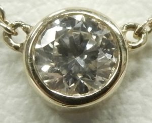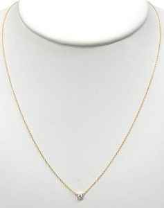 Good things come in small dimensions. This is one of the more delicate pendants we have in stock. Simple and petite designs like this go a long way when making a less is more statement. The small bezel setting contains a natural round brilliant diamond that is estimated to weight 0.16 carats and is of a conservative SI2-I quality. The light 1.0mm rolo link chain can be worn at 16 or 18 inches for some extra versatility.