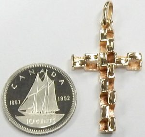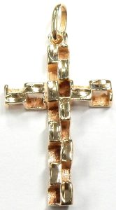 Bright cutting and heavy textures were a key design feature for jewellery in the early 1980s and this retro cross pendant is a perfect illustration of that 80s style. This cross is three dimensional and completely reversable, identical on both sides. As a biproduct of the construction, the inner nugget textured surfaces display a rosy hue from years of natural oxidation. The blush hue contrasts very well with the outer bright-cut highly polished surfaces on both sides.