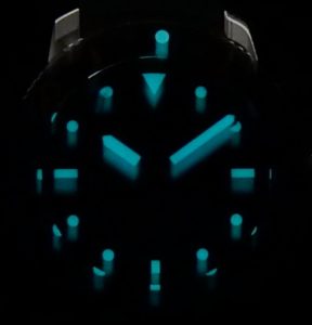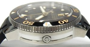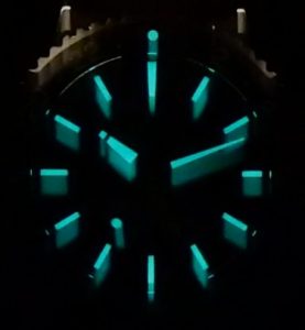 The gradient blue dial with radial finish is a thing of beauty, becoming darker toward the edge. The orange rubber strap is very flamboyant complimenting the blue dial with its orange highlights scattered about. The navy blue/black rotating bezel has been manufactured using super tough ceramic. Daylight (6:00-18:00 hours) are navy and night hours (18:00- 06:00 hours) displayed with black ceramic, all with bright white contrasting numbers. Bright luminous hands and, markers make time interpretation is the dark straight forward.