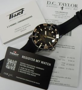 The factory supplied 2-year warranty has lapsed but we are happy to provide the next owner with a 1-year warranty covering the same aspects of the watch as the Tissot guarantee. If you’re looking to add to your collection with a striking diver’s watch or are just getting into the Swiss watch hobby, a modern Tissot like this is a great way to get your feet wet. Estate priced at $850.00 CAD. Stock #501-00407.