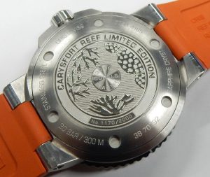 In keeping with the environmental friendly message of the Carysreef project, the brownish green inner box is said to have been made using regenerative algae even though it looks like regular plastic. An embossed image of a coral reef decorates the case back of the 43.5mm watch.