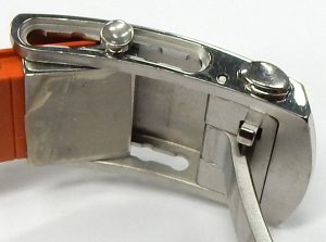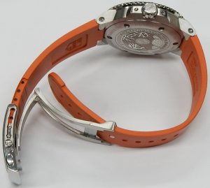 The watch is water resistant to 300 meter thanks to a protected threaded crown, screw on case back and pressure fit lab-grown sapphire crystal. The bright orange multi-length strap is fitted to a deployment buckle with a slick built in micro adjustment with 4 extra size adjustments.