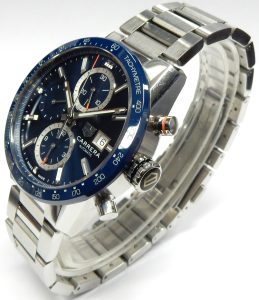 The Tag-Heuer Carrera and Porsche Carrera are both pinnacle products for each brand. TAG Heuer’s Carrera line was part of a great race in the mid-1960s to develop the first automatic winding chronograph. Heuer partnered with Breitling and Hamilton to face off against Zenith. Together they launched their Calibre 11 six months before Zenith’s El Primero hit the market. The caliber 11 was shown in a line of automatic chronographs that debuted in Geneve and New York. The launch included TAG’s Carrera, Autavia, and Monaco models. The original Carrera itself was designed and launched in 1963 by Jack Heuer as the first chronograph (not yet automatic) specifically designed for professional drivers. He was inspired by La Carrera Panamericana Mexican Road Race; one of the most famous events in auto racing history running only from 1950-1954. Porsche competed in the grueling Mexican race and won its class in 1952. The name Carrera is reserved for Porsche models of special high performance specification and race developed models. Our latest Carrera is a sporting watch that keeps the tradition of high performance mechanical timekeeping with an analogue stopwatch feature. The stopwatch registers are distinguished by the bright orange tips on the hands for hours, minutes, and seconds. The start/stop pusher button is also highlighted with and orange band. This is our first Carrera to feature a blue dial with a super hard and resistant ceramic tachymetre bezel scale. The sharp edged bezel has historically been made of stainless steel that is prone to getting dents and dings as it sits outside the case diameter. This design should fend off the pesky impact marks. The sunburst blue dial with silver register rings is very attractive, seeing some colour on a Carrera is welcome as most we see are black. This watch is in lightly worn original condition showing only minor scuffs and light scratches on the case and bracelet. If you’d like a current edition blue ceramic Carrera, it is shown on the Tag Heuer website for $8,950.00. Our lightly worn Carrera comes with its warranty card (not dated), instructions, and packaging. The watch is running great and keeping excellent time. Included with purchase is our complimentary 1-year warranty. Price is $3,100.00 CAD. 520-00178.