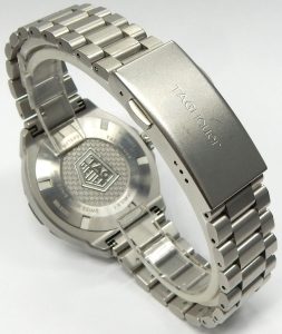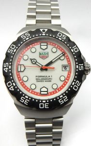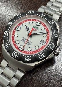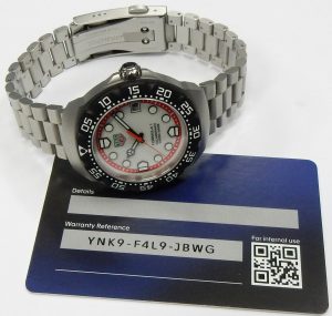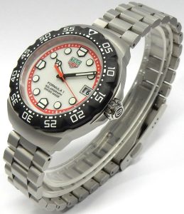 The watch that arguably saved the brand from extinction is back looking much as it did in 1985 but with modern technology. The Formula 1 was a superstar in the 80s, it was the watch to have, personifying the decade with bright coloured dials, straps and even colourful composite cases. They were the Swatch watch for the kids who had some money. We remember selling these way back then when they had a retail prices starting at under $300.00. Some of the newest Formula 1 models now feature “Solargraph” technology. The new quartz mechanism co-developed with  La Joux-Perret Manufacture in La Chaux-de-Fonds, Switzerland are powered by nothing more than exposure to natural or artificial light. Hidden behind the semitranslucent dial is a solar collector that can efficiently store a days worth of energy with just one minute of light exposure. A full charge is achieved after 40 hours of light exposure that lasts 10 months. The clever design also features a power save mode; when not in the light the movement enters into a power conservation mode, once exposed to light again it comes back to life after about 10 seconds. Tag Heuer say rechargeable power cell should be good for 15 years before needing replacing. That means this watch needs zero maintenance until the year 2040! The Formula 1 has always been an important watch for the brand. They have had several generations of style changes, always having a connection to the original. The newest incarnation is truly an homage to the first series. The case design is practically identical except brought up to a more modern 38mm diameter with much sharper edges, yet keeping that familiar silhouette. The timer bezel now rotates in both directions with 60 indexes, the crystal is a huge upgrade to lab-grown sapphire which will stand up far better the the 80s glass crystals. The guarded crown is a simple design, pull out to adjust rather than being threaded. Tag Heuer still rate the watch with a water resistance rating of 100 meters. You won’t find the Rolex inspired Jubilee style bracelet on this Formula 1, the newest F1 bracelet is an equally comfortable design featuring 3 segment links that resemble a Rolex Oyster link except much shorter. There is no diver extension concealed under the locking buckle but it is short and has a comfortably low profile. The silvery white dial is very similar to the 80s versions with red chapter ring indexed for minutes and logo shaped markers for 6, 9 and 12. The luminous hour plots are now applied rather than just printed. All and all we love the, “what’s old is new” vibe of the latest Formula 1. This example is in virtually new condition. It is only a few months old and was only occasionally worn during that time. There are only a couple of minute scuffs on the buckle that we could find as evidence of any use. It was bought in Ontario at an authorized Tag Heuer agent and benefits from the balance of the factory warranty. This is a new model shown on the Tag Heuer website with a suggested retail price of $2,550.00. Our hardly worn model comes with the original packaging and documents. It is estate priced at $2,100.00 CAD. Stock #520-00188.