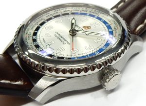 This 1 owner watch has only been lightly worn and remains in original condition, never polished or refinished. There are minor scuffs and scratches that are easily removed if you wish. It comes complete with the inner/outer presentation box, instruction booklet, warranty card, and a never out of its folder polishing cloth. We are happy to provide the next owner with a complimentary 1-year warranty. Christopher Ward still produce a Sealander GMT but they gave in to convention and now offer a regular 24 hour bezel model without the 15 timer portion and the water resistance rating is only 500 feet vs. 2000 for our version. This unusual and rare watch is estate priced at $1,500.00 CAD. Stock #501-00419.