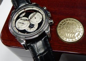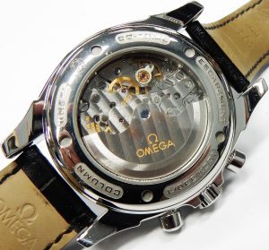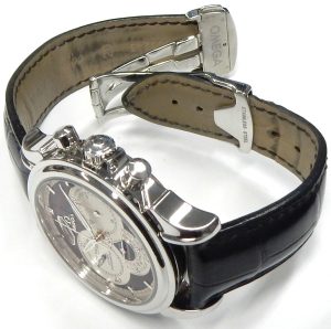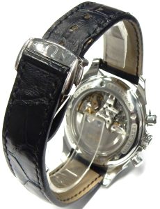 The case is crafted from highly polished stainless steel and has a water resistance rating of 100 meters thanks to a threaded crown and case back with movement display window. A 23mm lug width allows an easy selection of leather strap choices should you prefer something other than the blemish free, factory-equipped white stitched chocolate brown calf strap or the additional dark navy blue alligator strap with signed buckle.