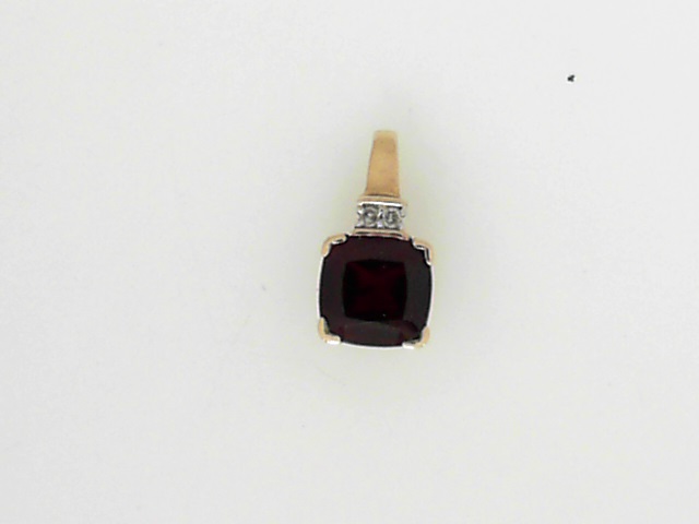 Cubic Zirconium Estate Pendant 10 Karat Yellow Red Cubic Zirconium Pendant Gram Weight 1.22 Chain Style: No Chain 1 Center Cubic Zirconium Shape: Cushion; Colour: Red With 2 Round Diamonds