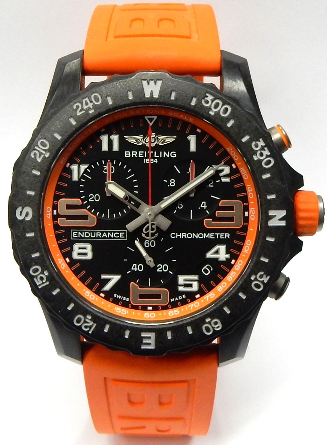 Estate Breitling Chronograph Year: 2022 Vendor Style #: X82310A51B1S1 Endurance Pro orange SN: 6423093 44mm CARBONOX Dial: Black/Orange Arabic Box Not Included/Papers Included Condition Excellent 1 Year Warranty