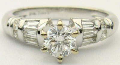 Estate Diamond Engagement Ring 18 Karat White Estate Engagement Ring Finger Size 6.5 Gram Weight 4.4 Center Diamond Shape: Round; Clarity: SI2; Colour: F Various Shapes Diamond 0.28 ctw 0.66