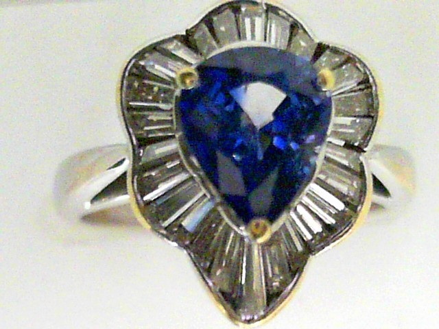 1 Center Sapphire 1.66ct Shape: Pear; Clarity: VS; Colour: Violetish Blue With 26 Baguette Diamonds 0.52 ctw