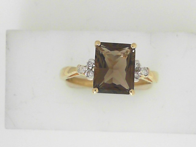 Smokey Quartz Estate Ring 10 Karat Yellow Brown Smokey Quartz Ring With Finger Size 10 Gram Weight 2.93 1 Center Smokey Quartz 2.87ct Shape: Emerald; Colour: Brown With 6 Round Diamonds 0.10 ctw